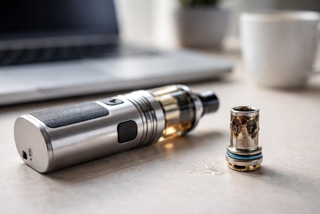 Lors de l’utilisation d’une cigarette électronique, la texture et le goût de la vapeur sont des éléments cruciaux. Une résistance en bon état produira une vapeur douce, avec un goût agréable et conforme au e-liquide choisi. Au contraire, une résistance en fin de vie peut altérer la vapeur, qui devient âcre ou amère. Ce phénomène résulte souvent de l’accumulation de résidus : le coton peut se dégrader et altérer la composition aromatique. Cela est d’autant plus vrai si l’utilisateur utilise des e-liquides fortement sucrés, qui tendent à laisser des dépôts plus importants.